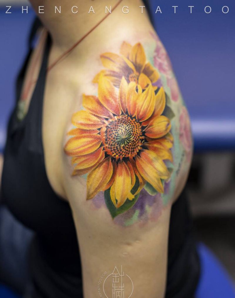花开向阳 | 针藏刺青 ·邵钢纹身图片_肩部欧美写实针藏邵钢纹身图案