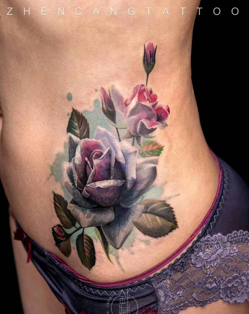 玫瑰【旧图遮盖】| 针藏刺青纹身图片_腹部欧美写实水彩针藏刺青邵钢老师遮盖纹身图案