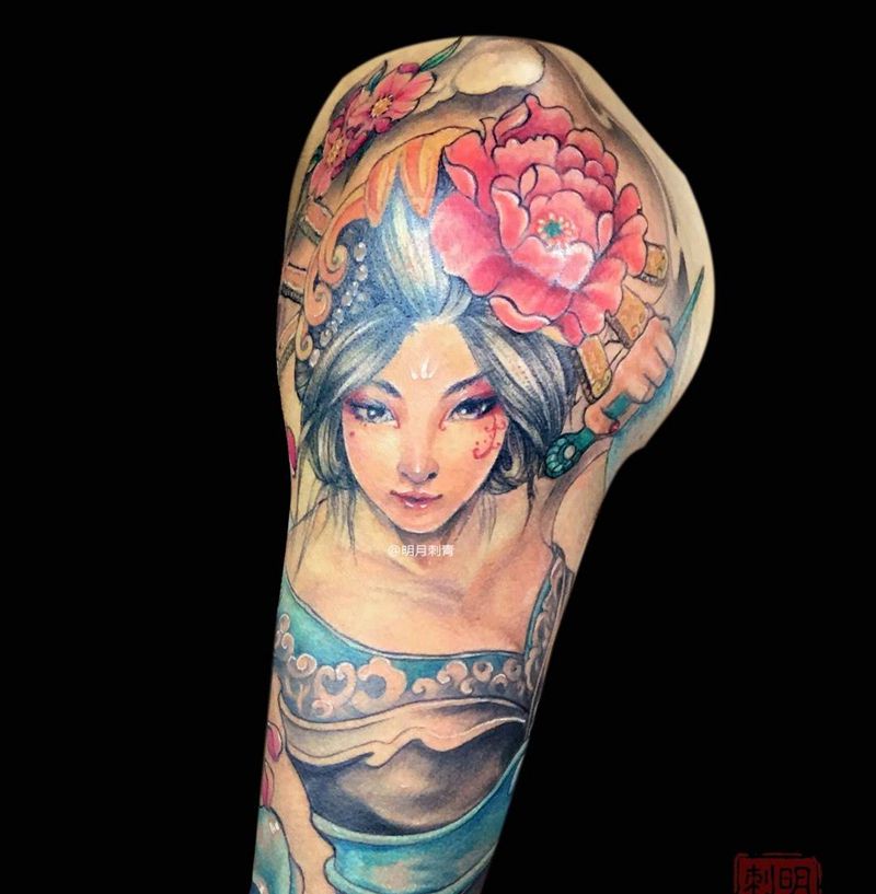 《红颜》玲珑纹身图片_成品手臂传统人物明月艺伎艺伎明月中国原创纹身图案