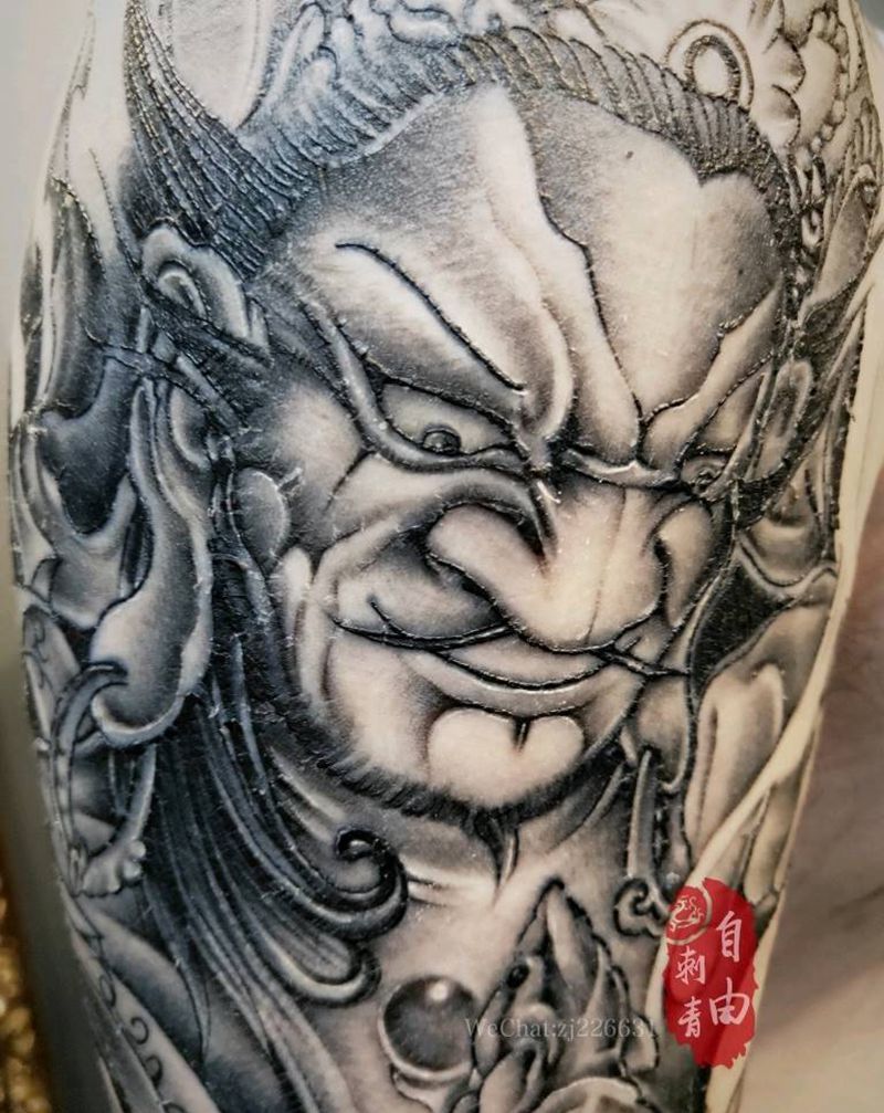 当前位置: 首页 >上海市纹身店-自由刺青纹身图案>黄财神半甲纹身图片_手臂新传统财神纹身图案