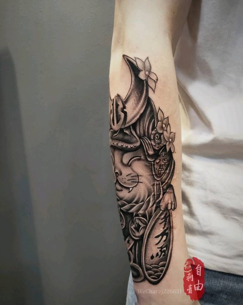 武士猫纹身图片_手臂新传统武士猫纹身图案