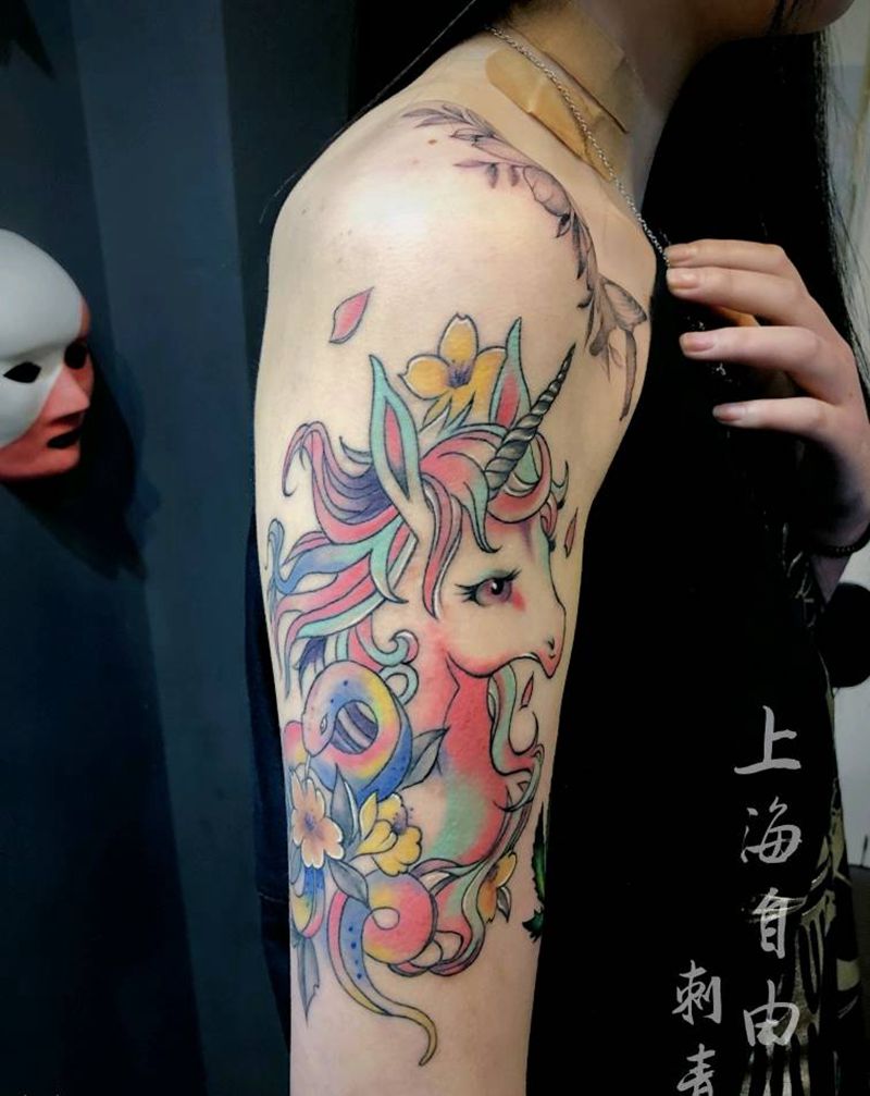恢复好的图纹身图片_手臂水墨水彩独角兽纹身图案