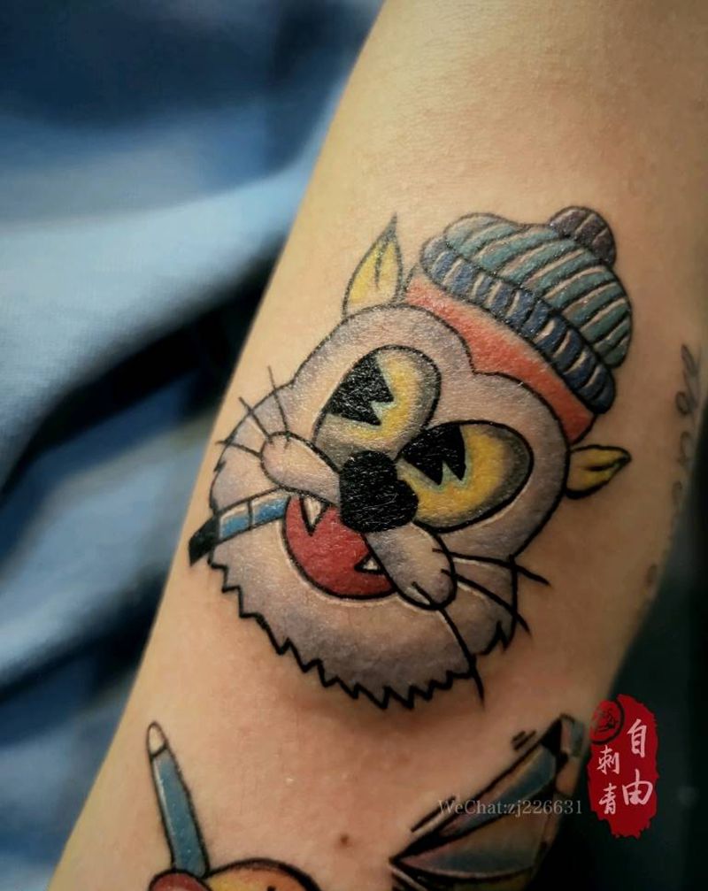 当前位置: 首页 >上海市纹身店-自由刺青纹身图案>new school纹身图片_手臂New School海绵宝宝猫钻石纹身图案
