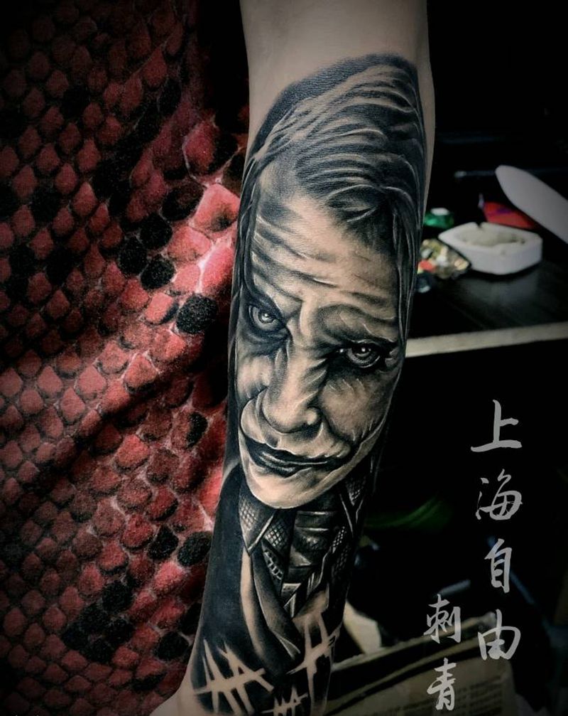 当前位置: 首页 >上海市纹身店-自由刺青纹身图案>小丑纹身图片_手臂欧美写实小丑希斯莱杰纹身图案