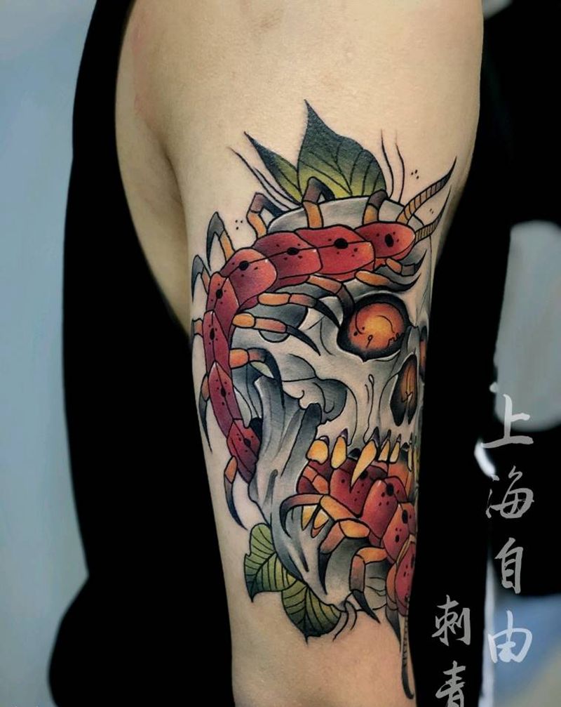 当前位置: 首页 >上海市纹身店-自由刺青纹身图案>骷髅蜈蚣纹身图片_手臂New School骷髅蜈蚣纹身图案