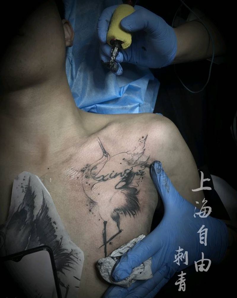 当前位置: 首页 >上海市纹身店-自由刺青纹身图案>仙鹤纹身图片_胸部水彩水墨仙鹤遮盖纹身图案