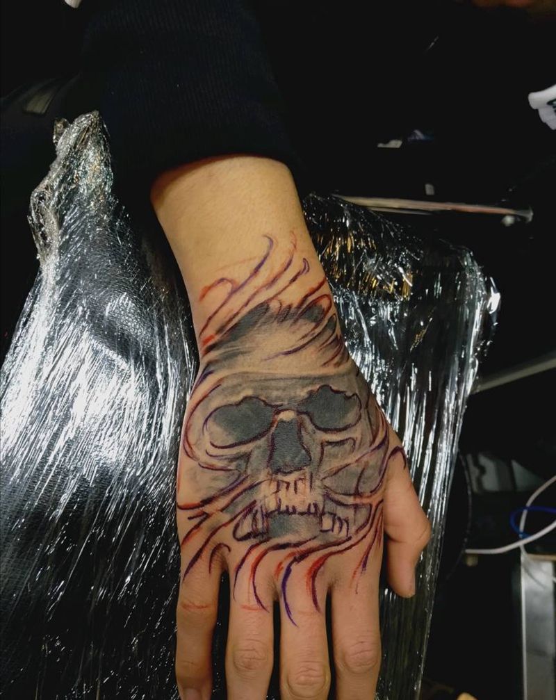 当前位置: 首页 >上海市纹身店-自由刺青纹身图案>骷髅遮盖纹身图片_手部欧美写实手背遮盖骷髅花手纹身图案