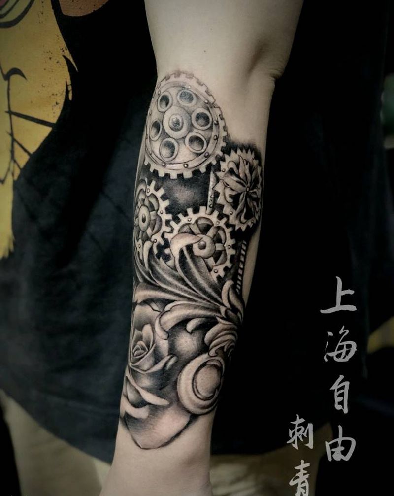 雕花玫瑰纹身图片_手臂欧美写实雕花玫瑰齿轮纹身图案