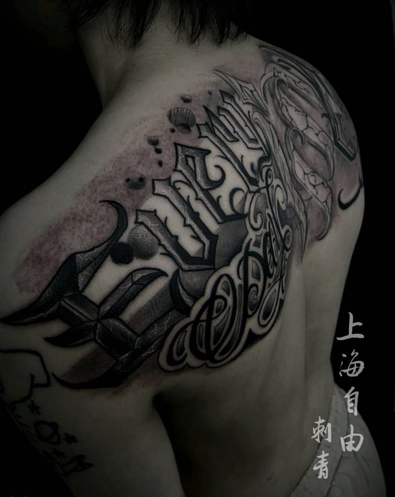 当前位置: 首页 >上海市纹身店-自由刺青纹身图案>Every day is co纹身图片_背部花体字肩膀花体字纹身图案