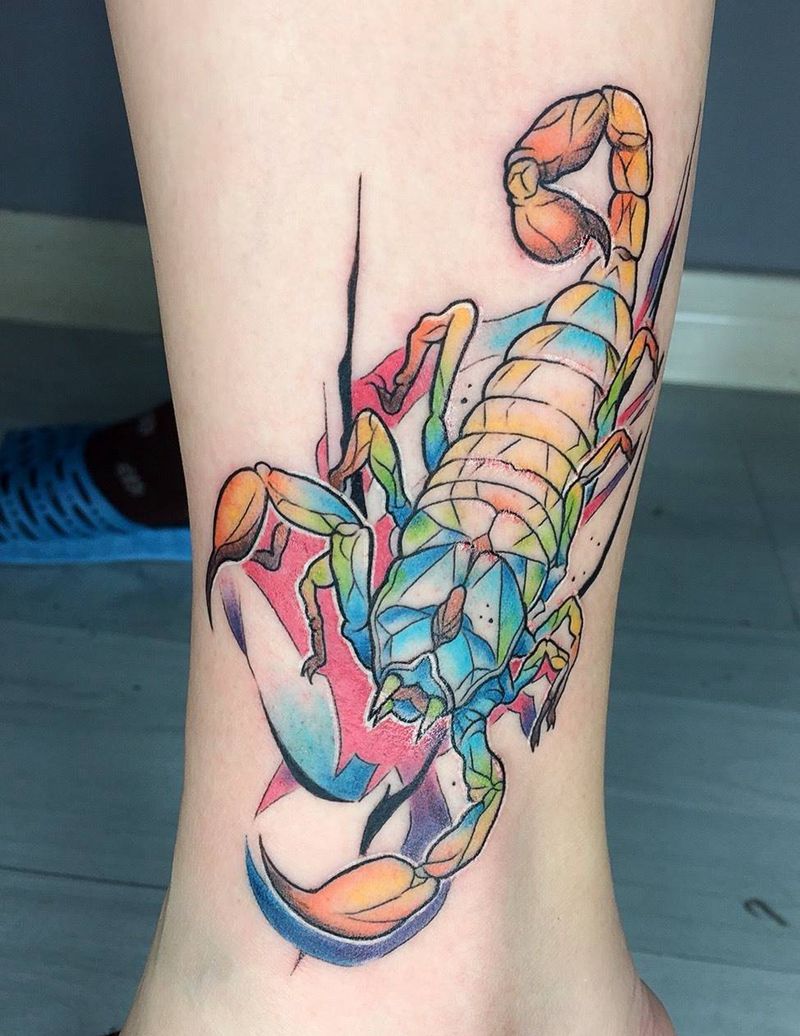 当前位置: 首页 >上海市纹身店-JSTATTOO纹身图案>不一样的天蝎座纹身图片_成品脚部腿部清新欧美动物水彩纹身图案