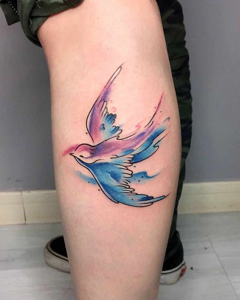 水彩小鸟儿纹身图片_成品腿部欧美清新动物水彩纹身图案