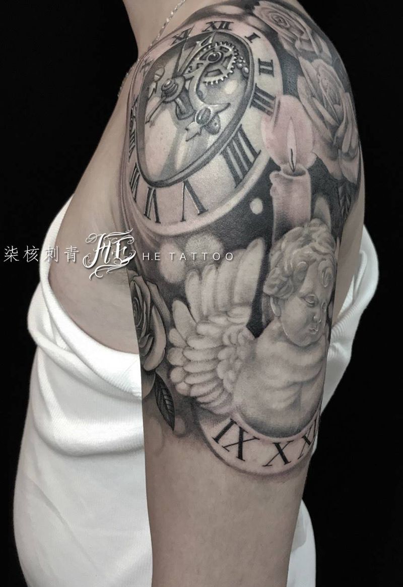 守护天使纹身图片_肩部手臂欧美写实原创纹身图案