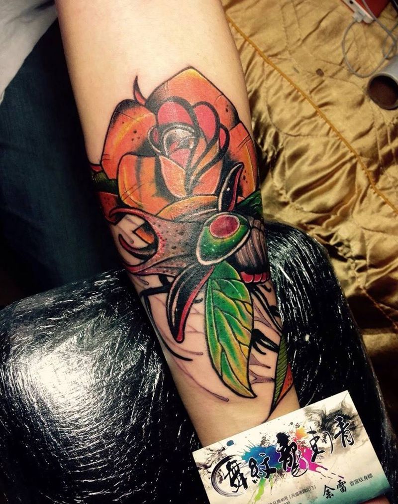 欧美甲壳虫遮盖纹身作品纹身图片_成品手臂欧美清新动物植物纹身图案
