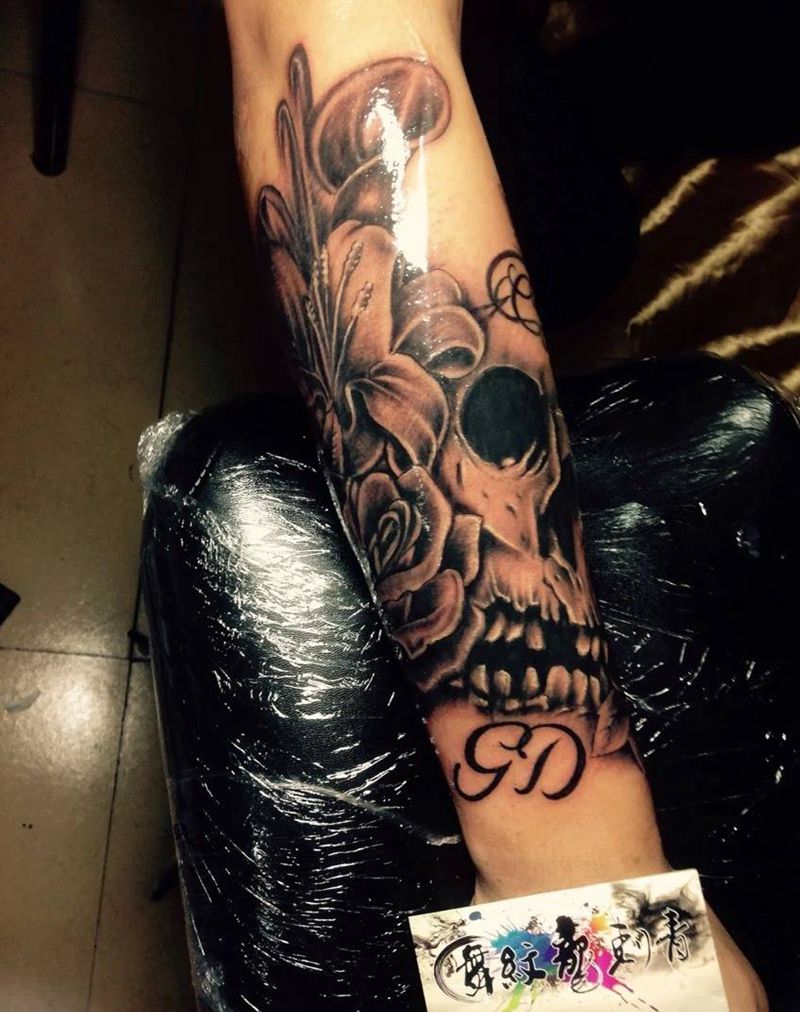 当前位置: 首页 >上海市纹身店-自由刺青纹身图案>骷髅头纹身图片_成品手臂写实传统鬼神纹身图案