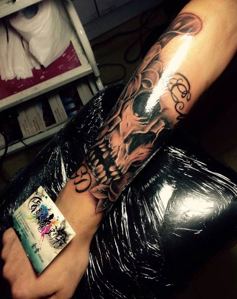 当前位置: 首页 >上海市纹身店-自由刺青纹身图案>骷髅头纹身图片_成品手臂写实传统鬼神纹身图案