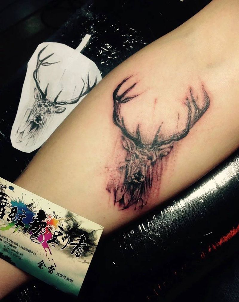 当前位置: 首页 >上海市纹身店-自由刺青纹身图案>鹿纹身图片_成品手臂传统写实动物纹身图案
