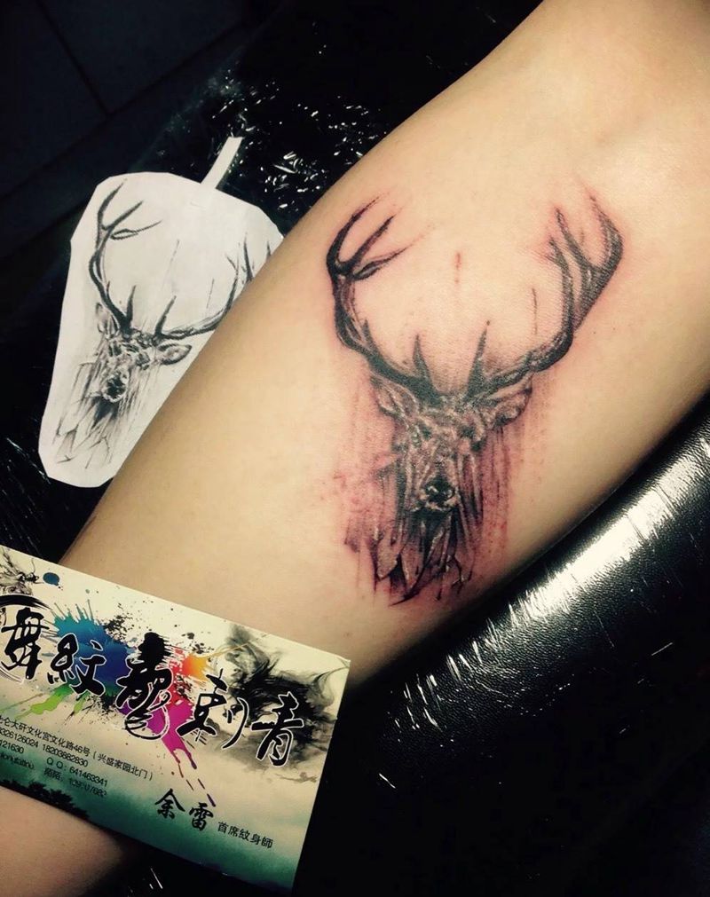 当前位置: 首页 >上海市纹身店-自由刺青纹身图案>鹿纹身图片_成品手臂传统写实动物纹身图案