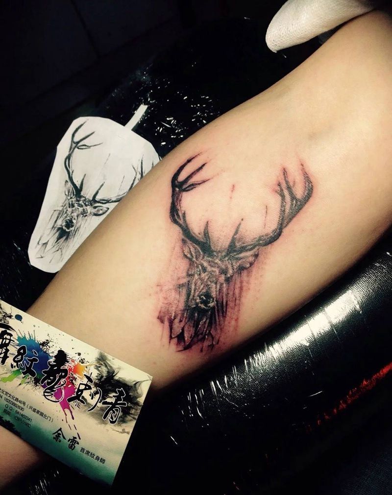 当前位置: 首页 >上海市纹身店-自由刺青纹身图案>鹿纹身图片_成品手臂传统写实动物纹身图案