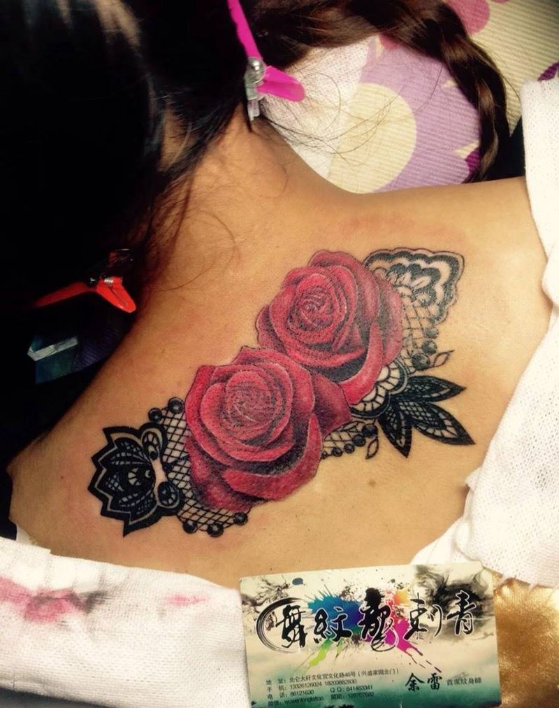 玫瑰纹身图片_成品肩部背部写实传统植物纹身图案