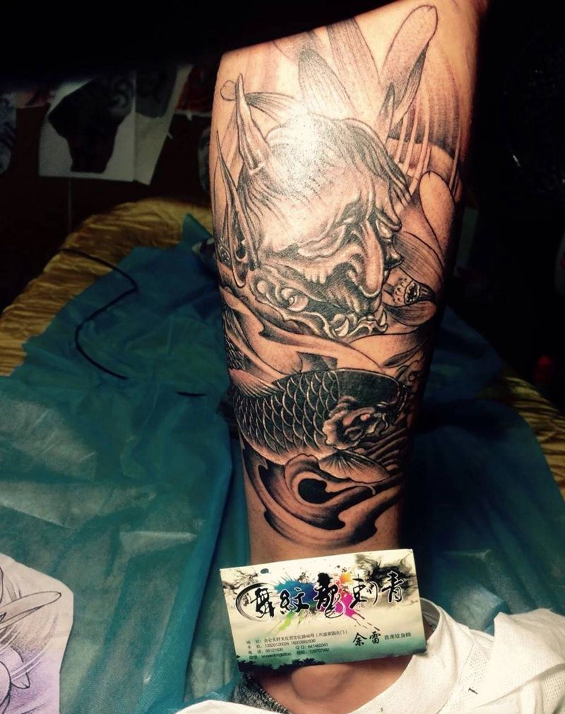当前位置: 首页 >上海市纹身店-自由刺青纹身图案>班若纹身图片_成品腿部传统人物鬼神动物纹身图案