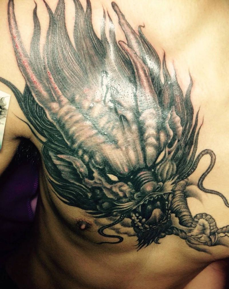 当前位置: 首页 >上海市纹身店-自由刺青纹身图案>龙首纹身图片_成品胸部传统写实动物鬼神纹身图案