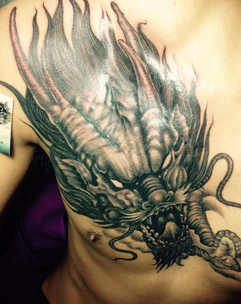 当前位置: 首页 >上海市纹身店-自由刺青纹身图案>龙首纹身图片_成品胸部传统写实动物鬼神纹身图案