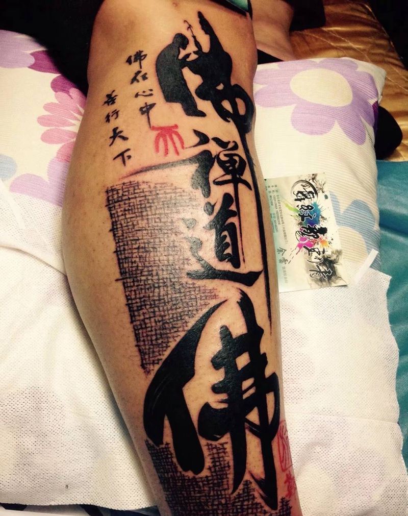 书法纹身作品纹身图片_成品腿部传统宗教字符图腾纹身图案