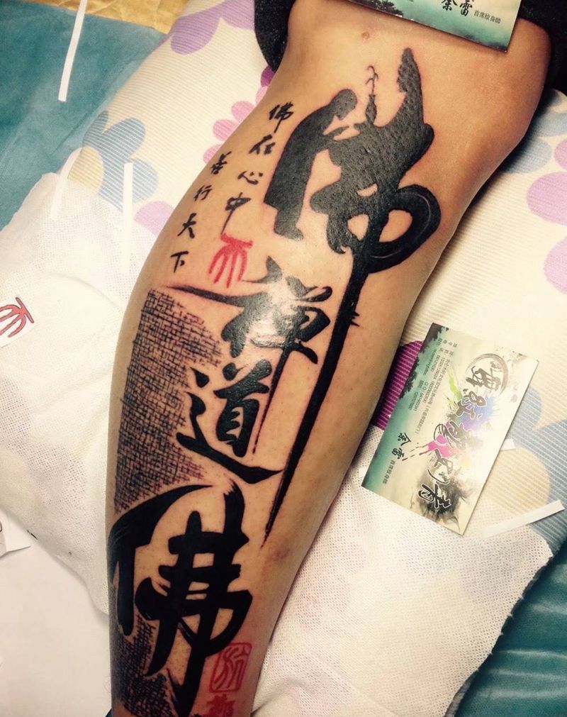 书法纹身作品纹身图片_成品腿部传统宗教字符图腾纹身图案