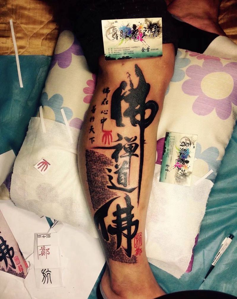 书法纹身作品纹身图片_成品腿部传统宗教字符图腾纹身图案