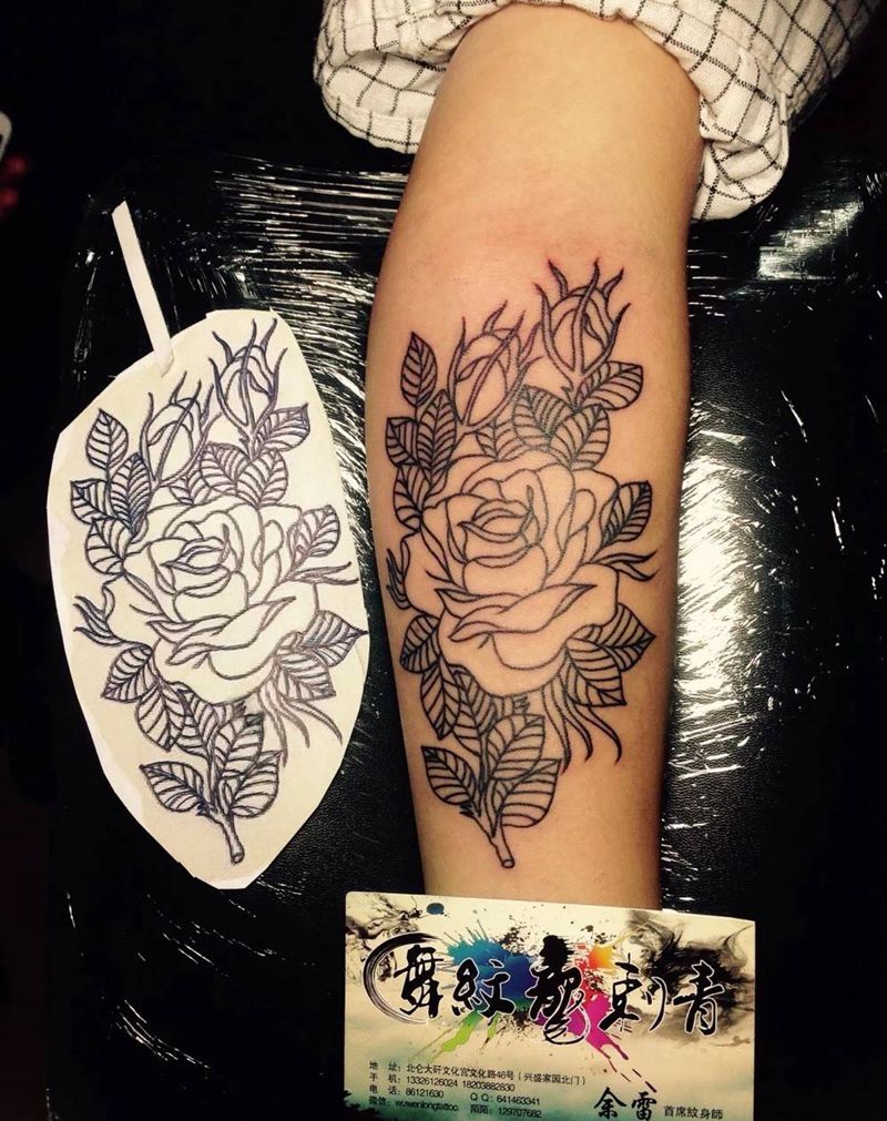 玫瑰纹身图片_成品手臂传统清新植物纹身图案