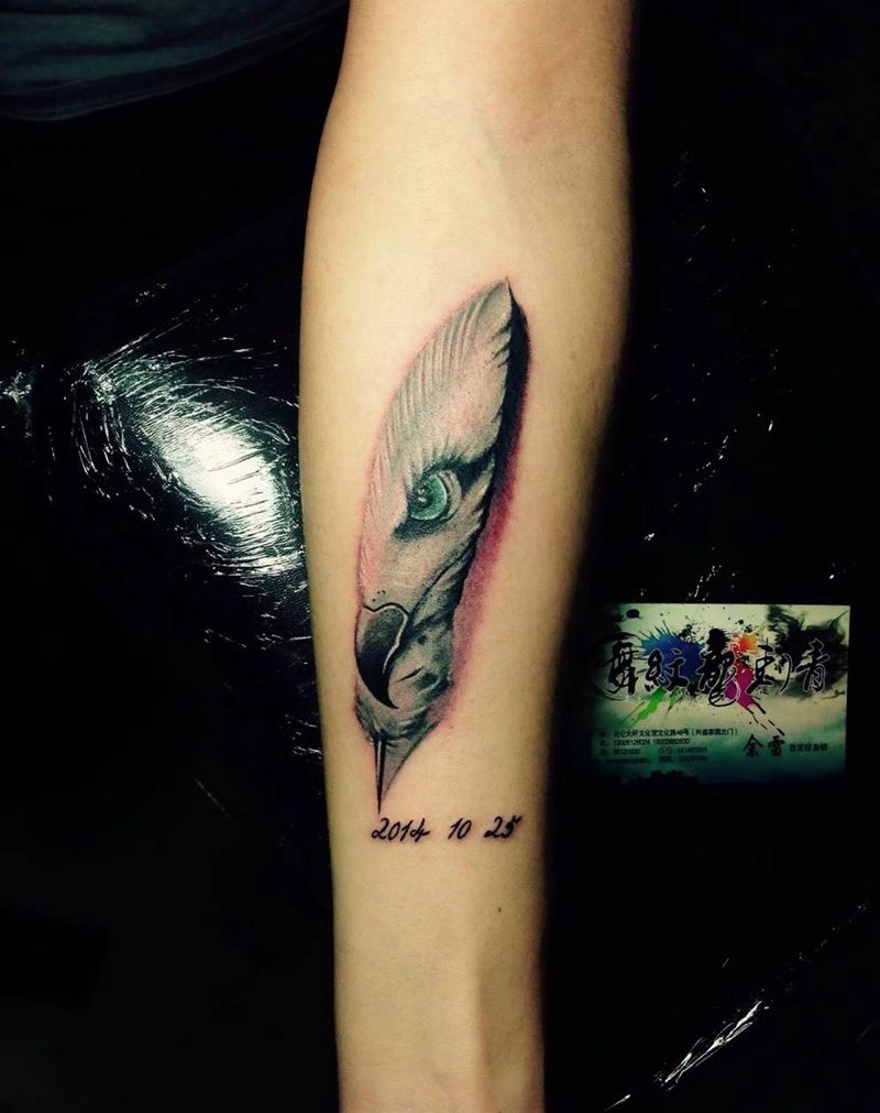 当前位置: 首页 >上海市纹身店-自由刺青纹身图案>鹰羽纹身图片_成品手臂写实清新动物纹身图案