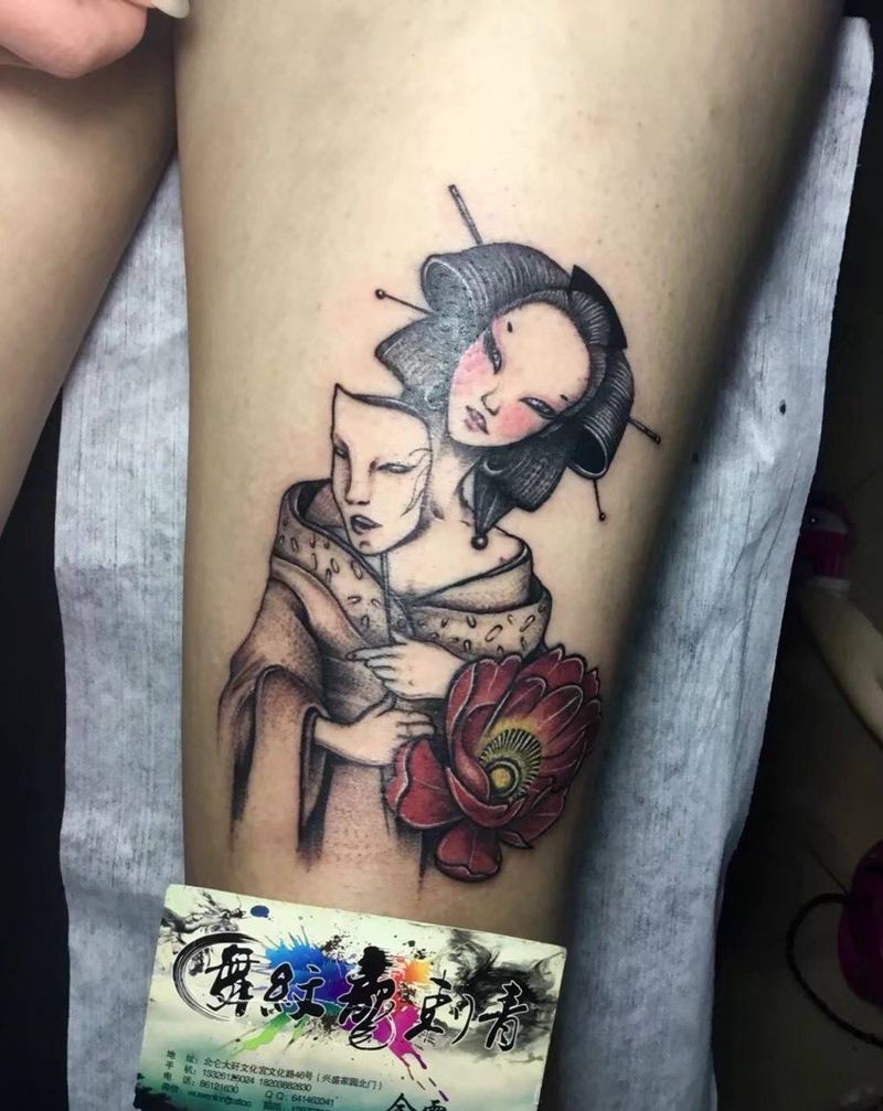 当前位置: 首页 >上海市纹身店-自由刺青纹身图案>艺妓纹身图片_成品腿部传统清新人物植物纹身图案