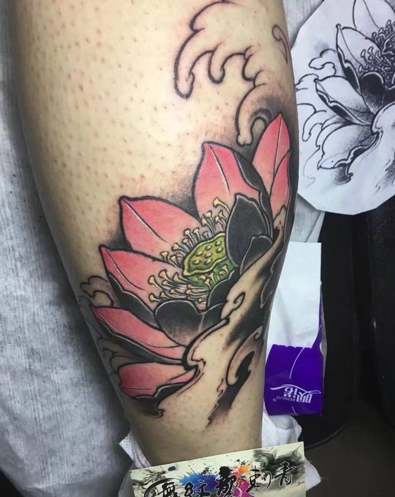 莲纹身图片_成品腿部传统清新植物纹身图案