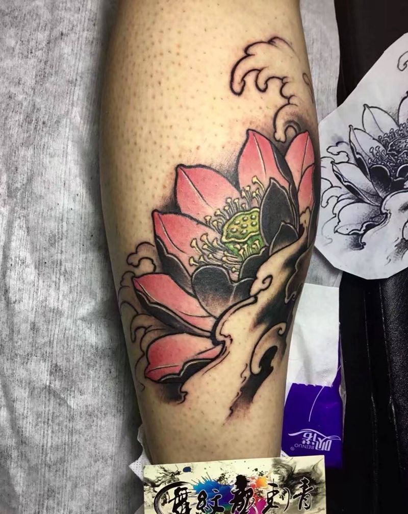 当前位置: 首页 >上海市纹身店-自由刺青纹身图案>莲纹身图片_成品腿部传统清新植物纹身图案