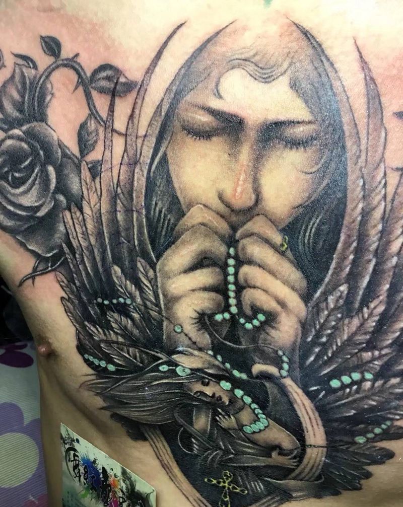 天使纹身图片_成品胸部传统欧美人物植物纹身图案