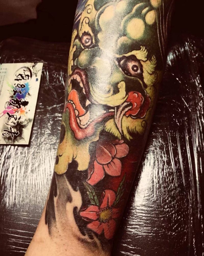当前位置: 首页 >上海市纹身店-自由刺青纹身图案>唐狮纹身图片_手臂传统动物鬼神纹身图案