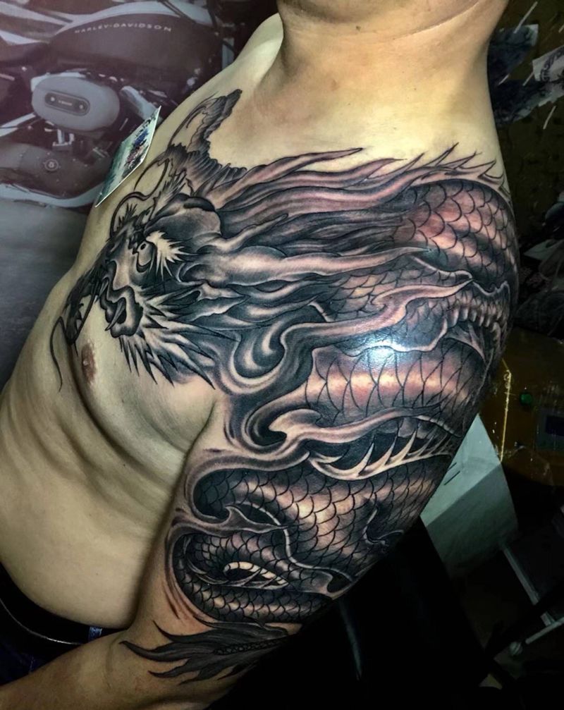 过肩龙纹身图片_成品胸部手臂传统动物原创纹身图案