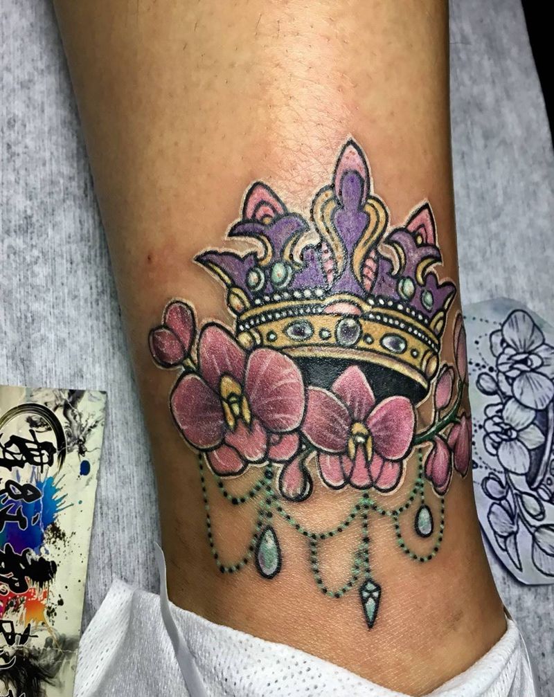 遮盖 蝴蝶兰纹身图片_腿部老传统水彩纹身图案