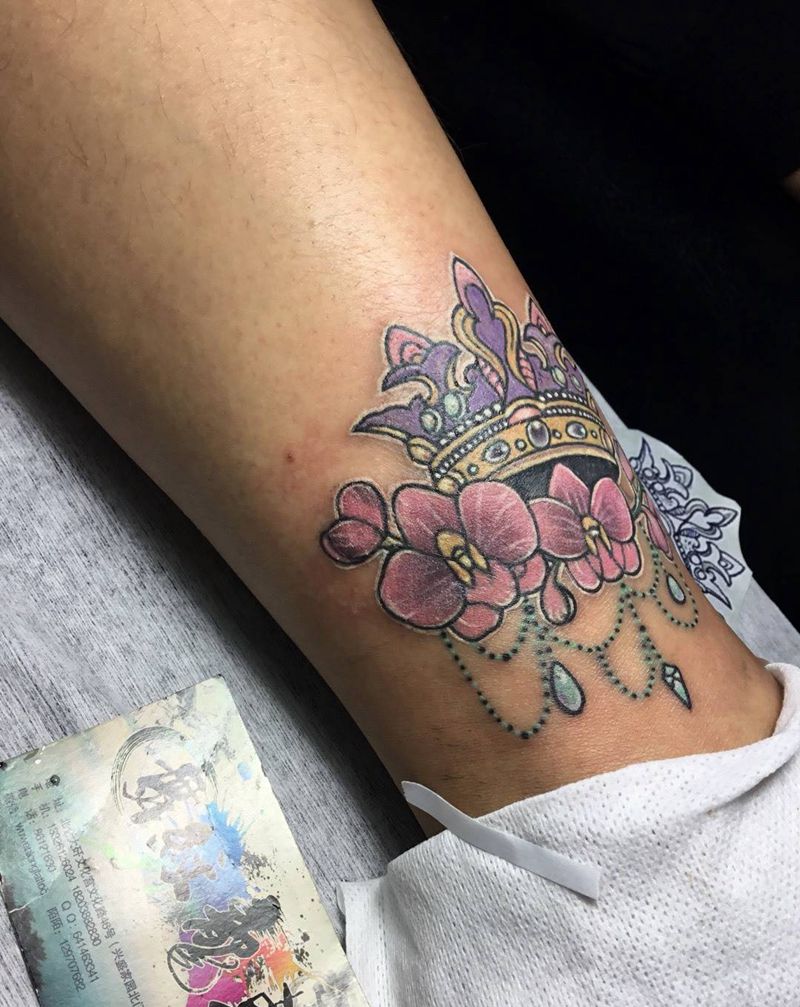 遮盖 蝴蝶兰纹身图片_腿部老传统水彩纹身图案