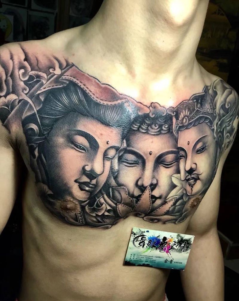 三面佛纹身图片_胸部老传统纹身图案