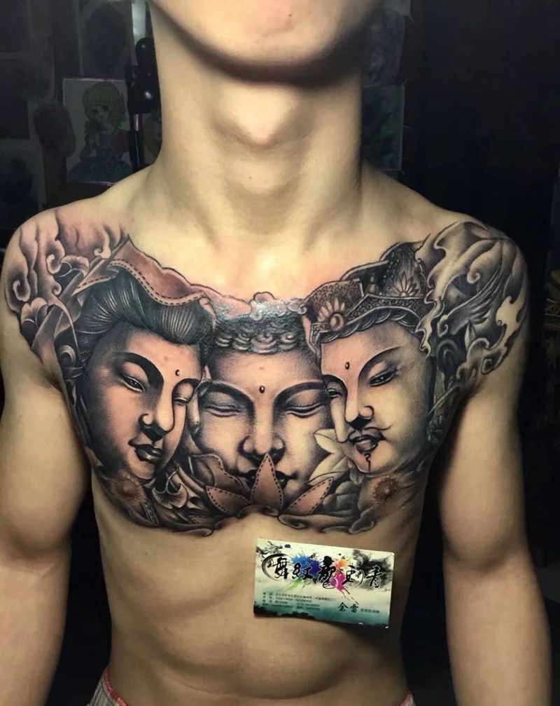 三面佛纹身图片_胸部老传统纹身图案