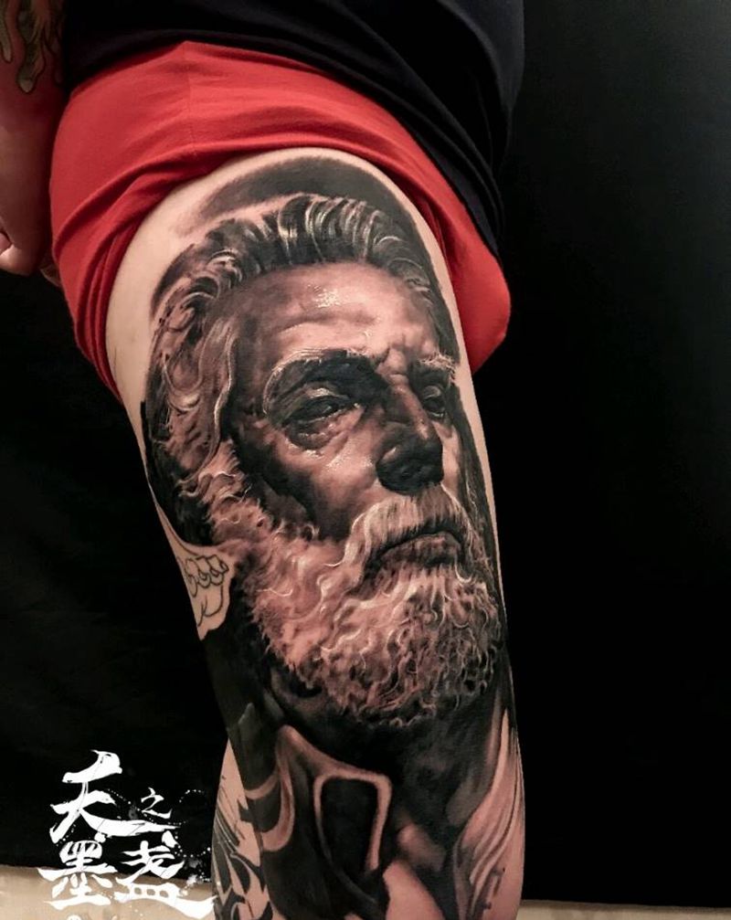 当前位置: 首页 >上海市纹身店-上海墨盏刺青纹身图案>有故事的花腿纹身图片_腿部欧美肖像写实人物纹身图案