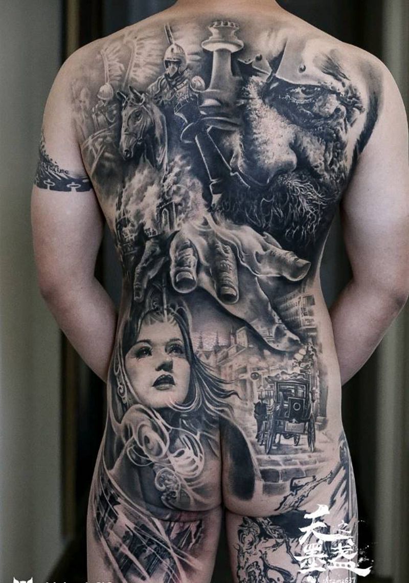 波兰战争纹身图片_背部欧美肖像写实人物原创成品纹身图案