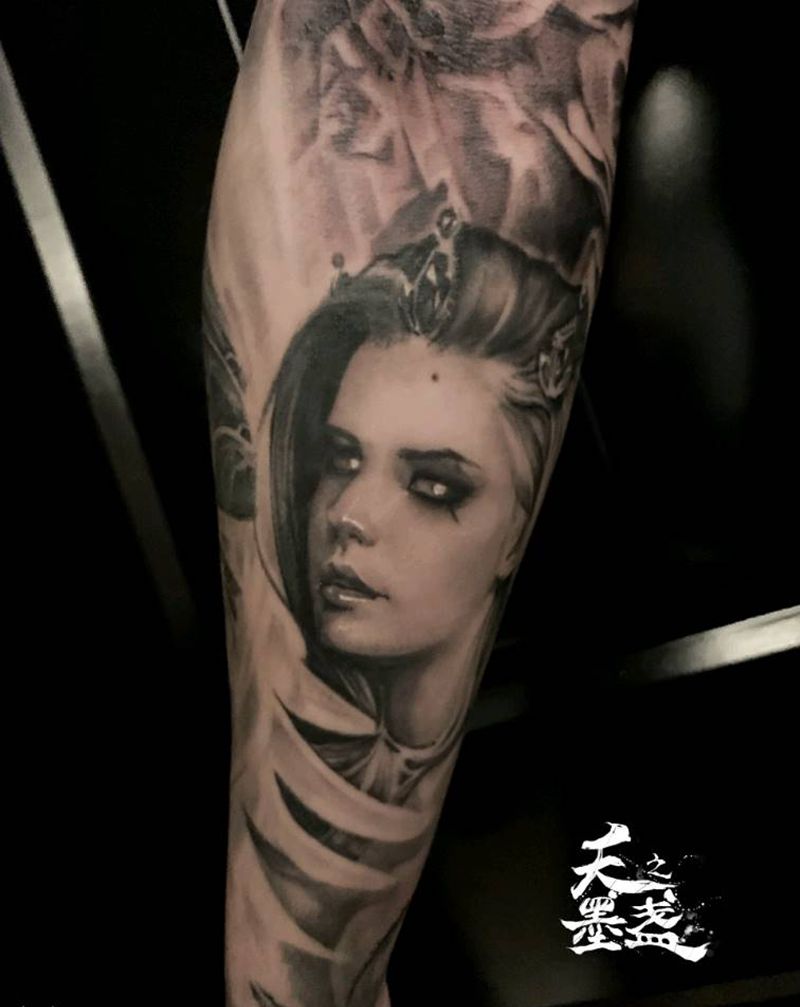 当前位置: 首页 >上海市纹身店-上海墨盏刺青纹身图案>花臂纹身图片_手臂欧美写实黑灰纹身图案