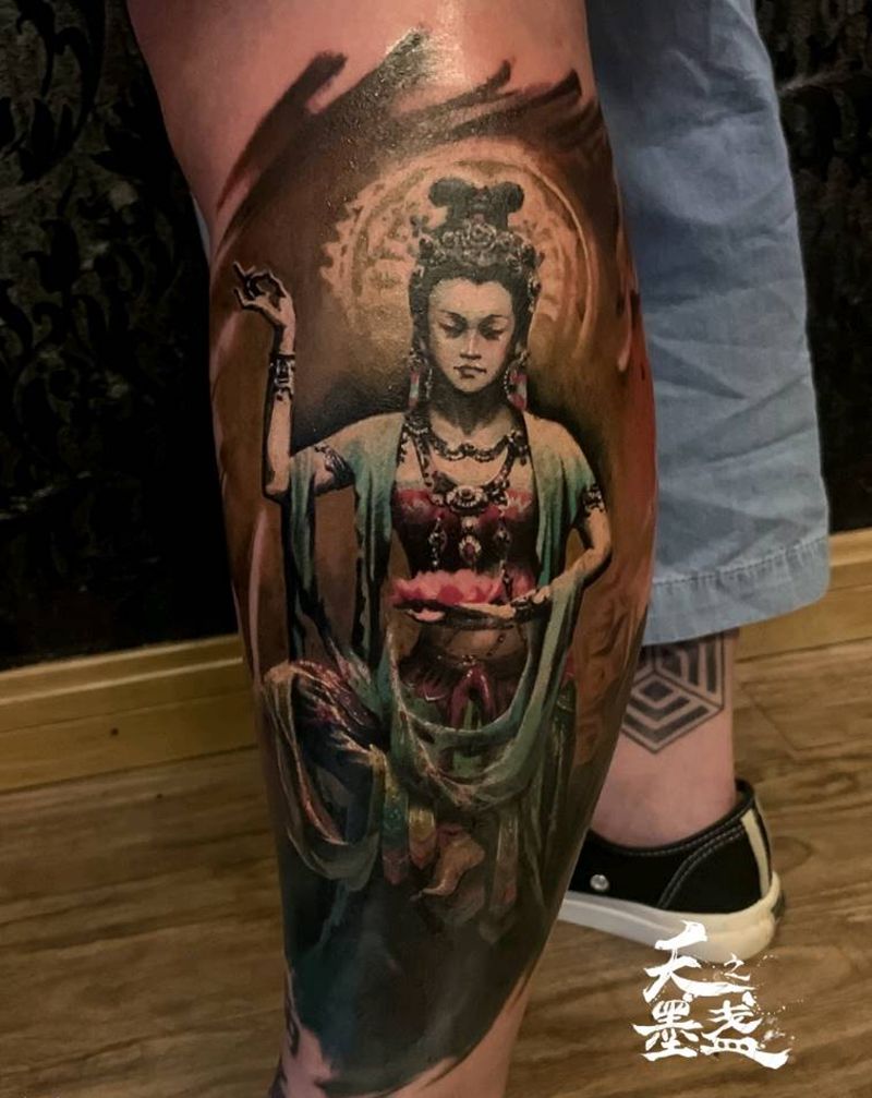 敦煌飞天纹身图片_腿部欧美写实油画纹身图案