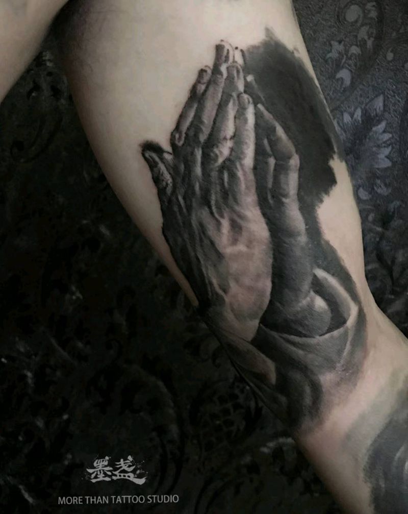 祈祷之手纹身图片_手臂欧美写实黑灰纹身图案