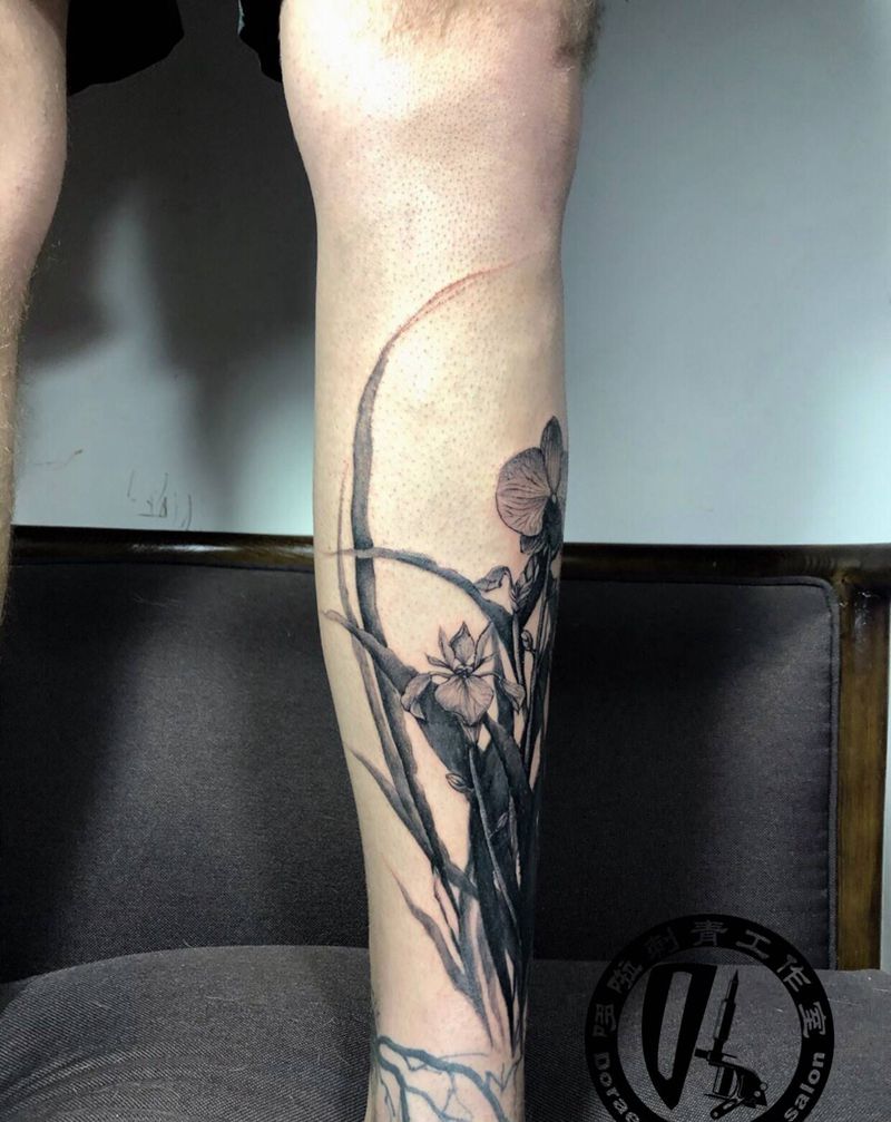 扎根纹身图片_腿部欧美写实水墨原创纹身图案