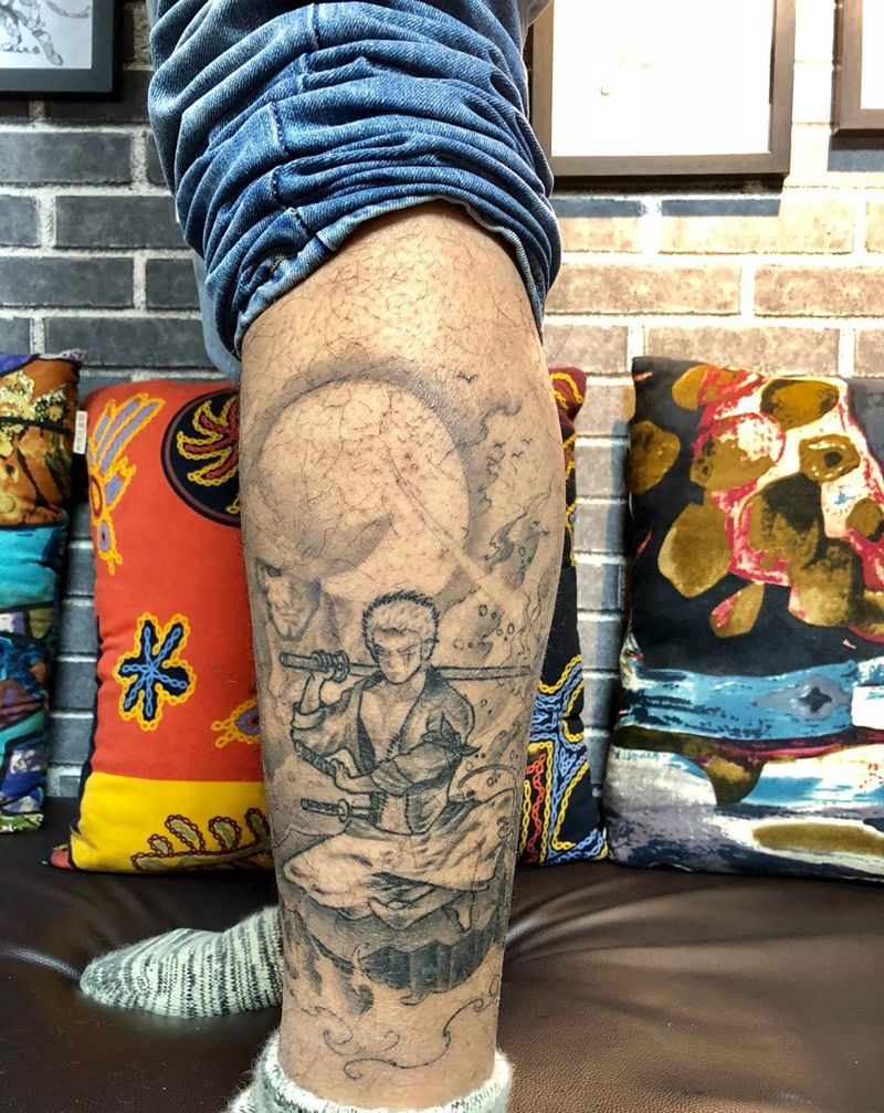 当前位置: 首页 >上海市纹身店-哆啦刺青纹身图案>盖纹身图片_成品腿部写实肖像人物鬼神纹身图案