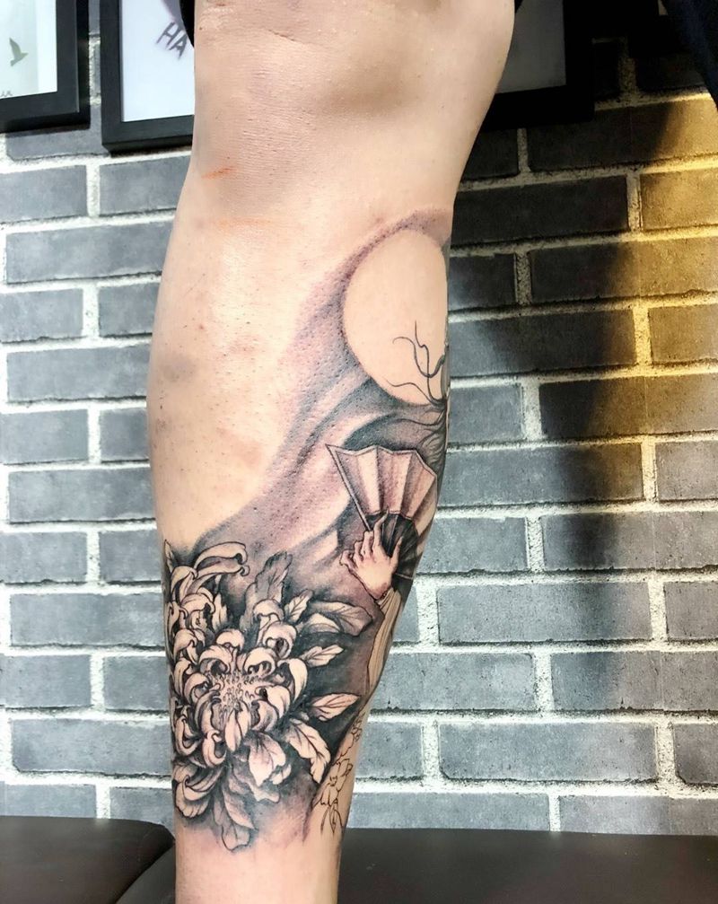 艺妓纹身图片_成品腿部传统肖像写实人物植物纹身图案