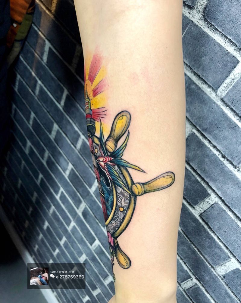 灯塔纹身图片_成品手臂欧美写实清新几何纹身图案